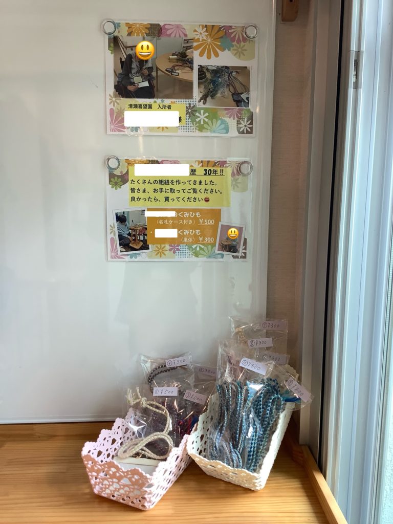 隣接する清瀬療護園ほのぼのカフェでは、ハンドメイド作品を販売できるスペース(ほのぼのBOX)が設けてあり、6月の間、そちらに置かせていただくことになりました。