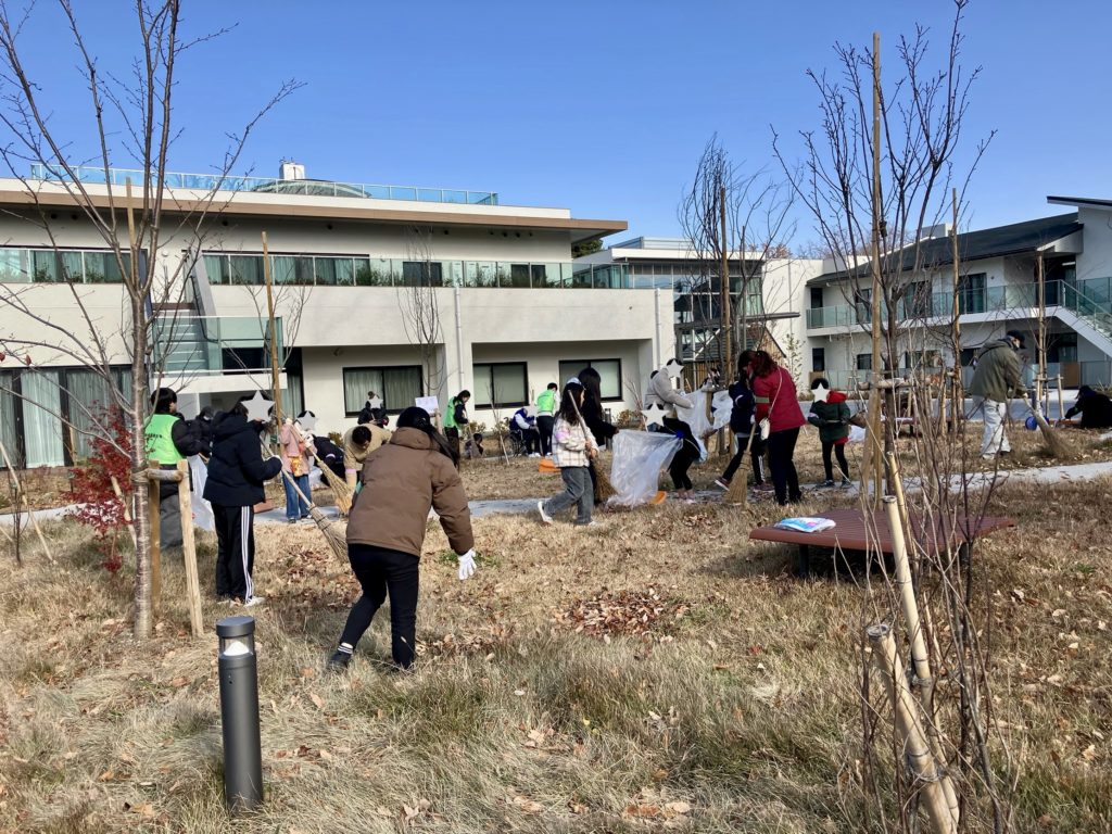 まずは、地域のクリーン活動。各グループに分かれて、落ち葉を拾います。喜望園には約30名の方々に落ち葉拾いをしていただき、ご利用者も袋を持ちお手伝いをしました。