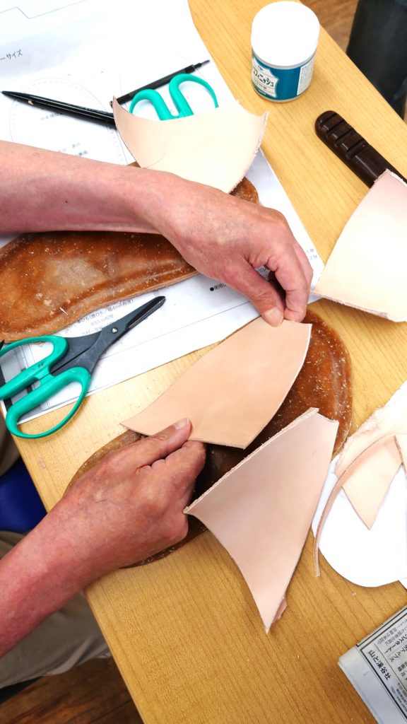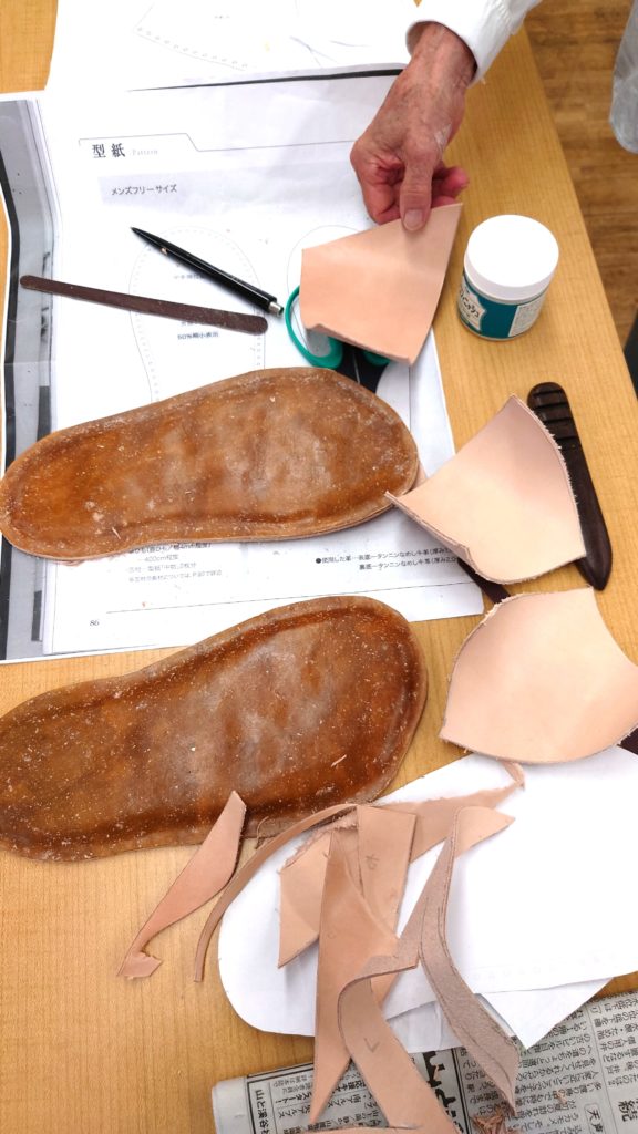 スリッパの底が完成し、今度は足の甲の部分を制作中です。立体になる部分でとても難しそうでした。