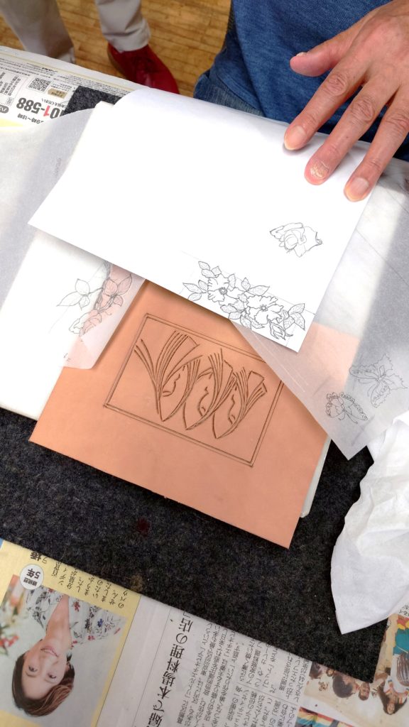3枚の皮を縦に並べて、ポケット付きの壁掛けを作るそうです。今は2枚目の制作中です。3枚目はどのような柄になるのでしょうか。