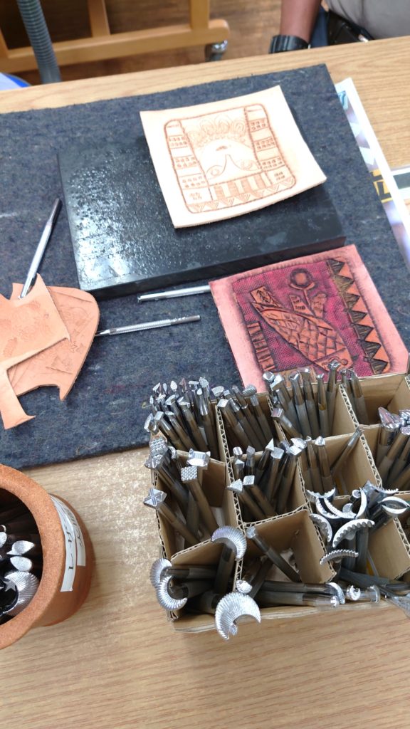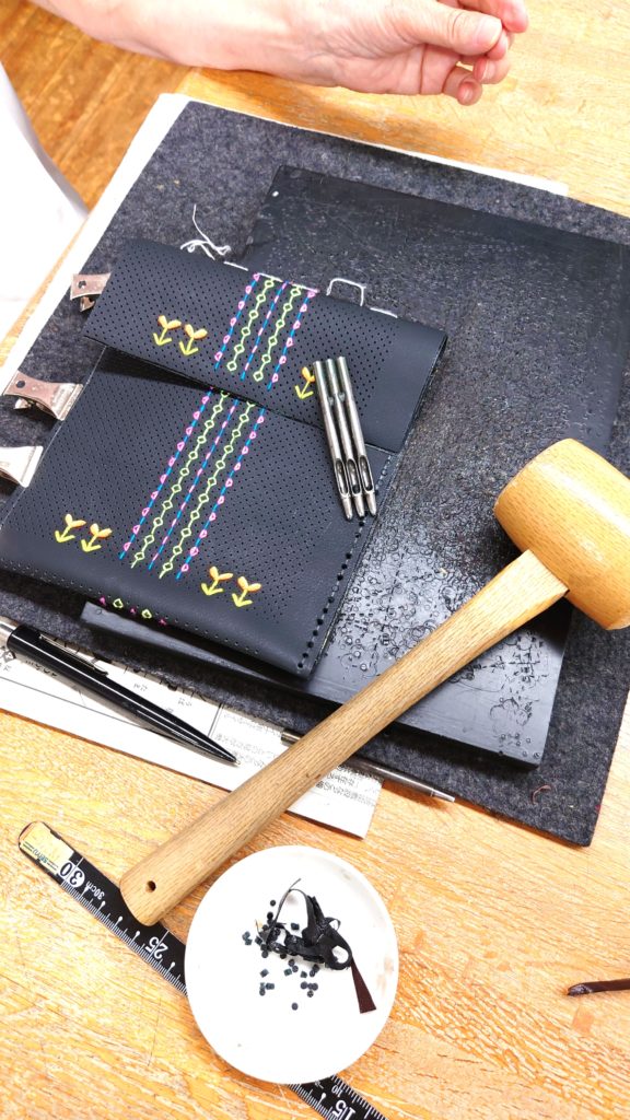 皮の端を縫うための穴あけ作業をされていました。ポーチになる予定です。ポーチの上に置いてある金属の道具で穴をあけていきます。