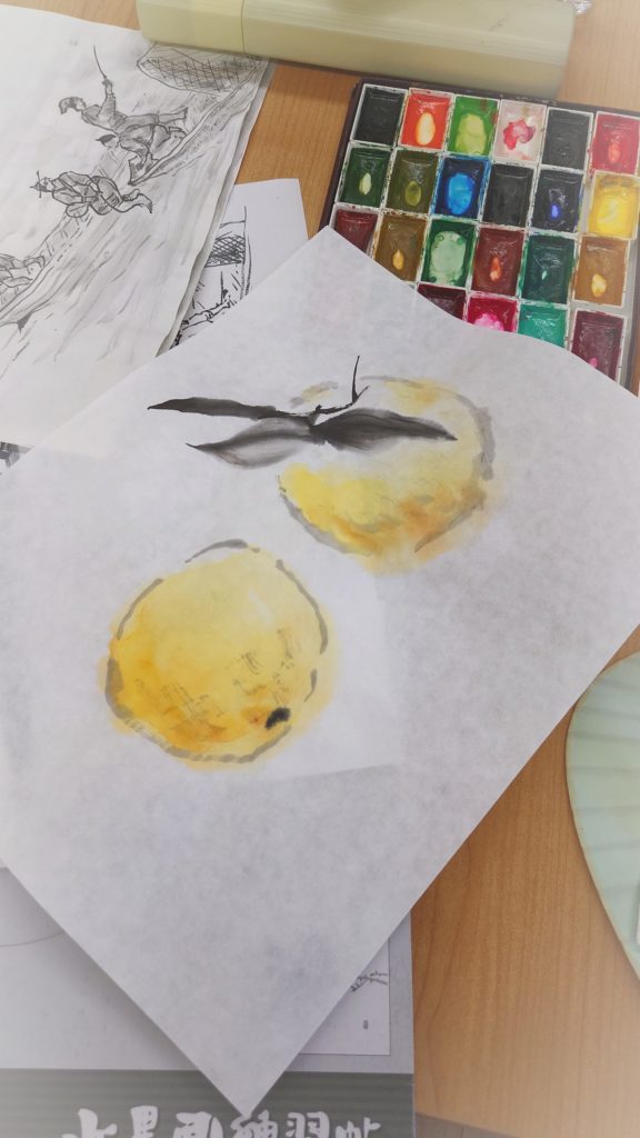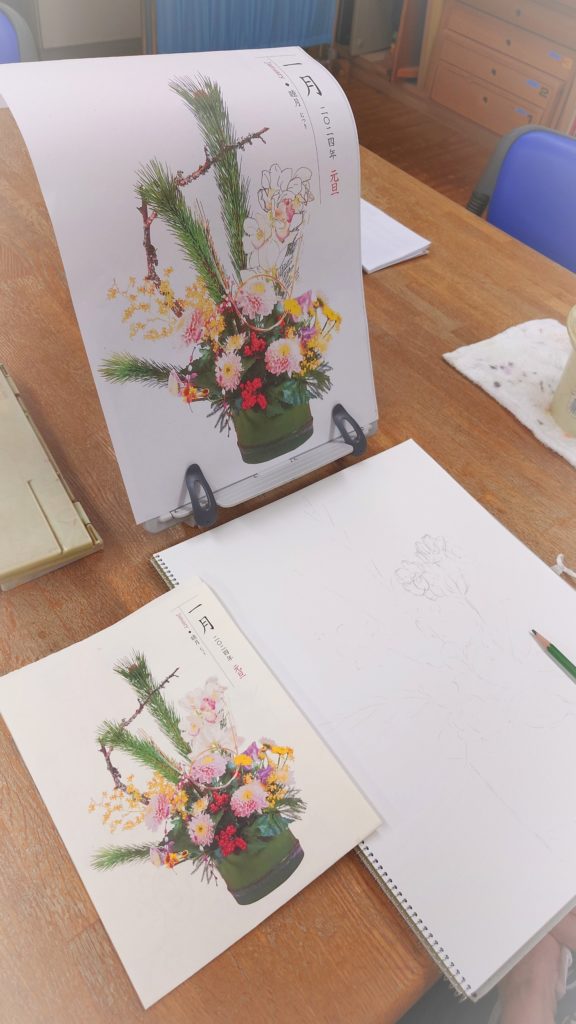 夏休みが終わると年末まであっという間です。来年の年始用の絵を描き始められました。季節のフラワーアレンジメントの模写です。
