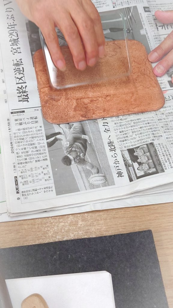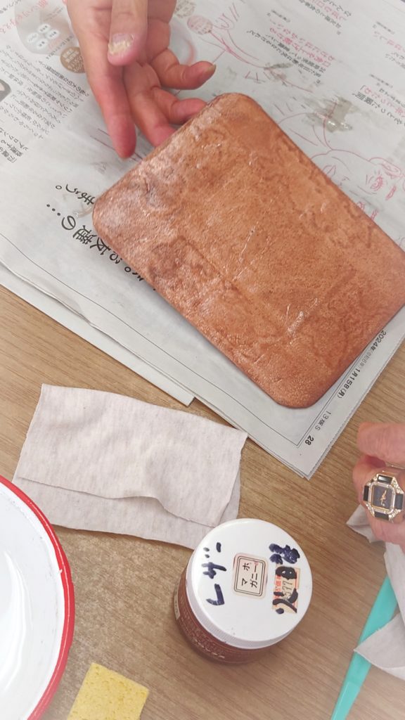 最後にトコフィニッシュという材料を使って仕上げていきます。今は塗った材料を広げていく様子です。