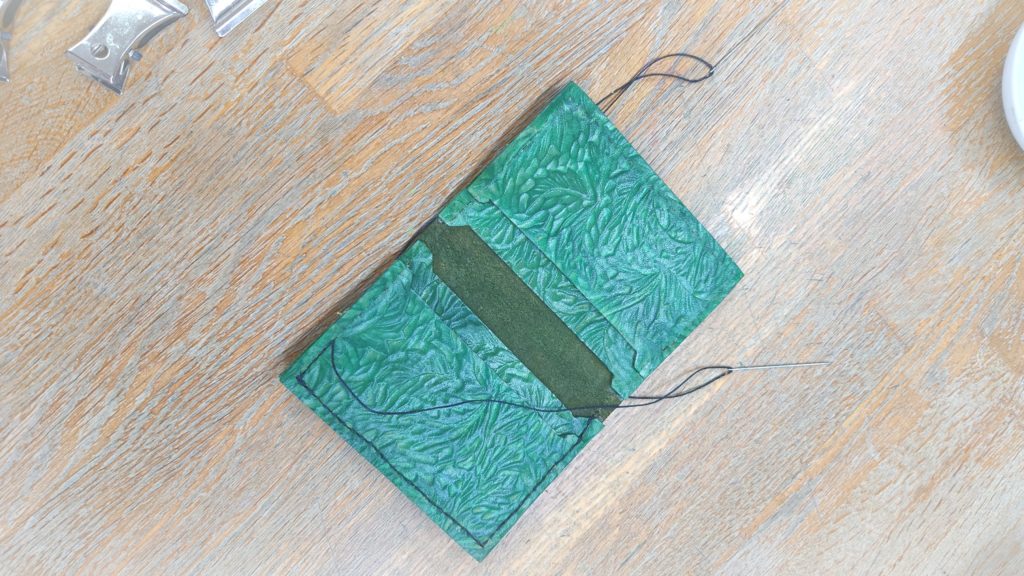 深緑の色合いがとてもいいですね。仕上げに周りを縫っています。完成まであと少しです!