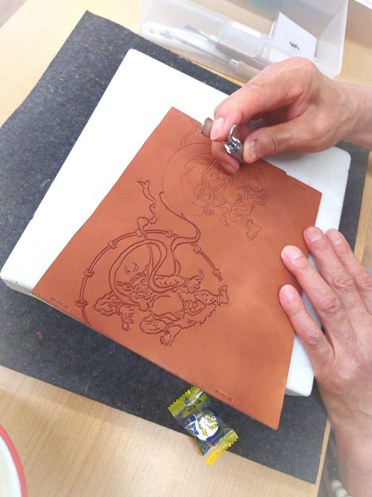 線の切り込みをいれているところです。力を入れて線を描いていきます。シンプルに見えて、とても慣れが必要な工程です。