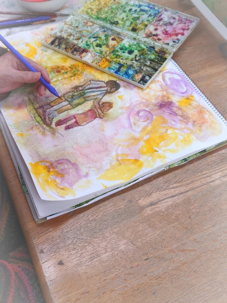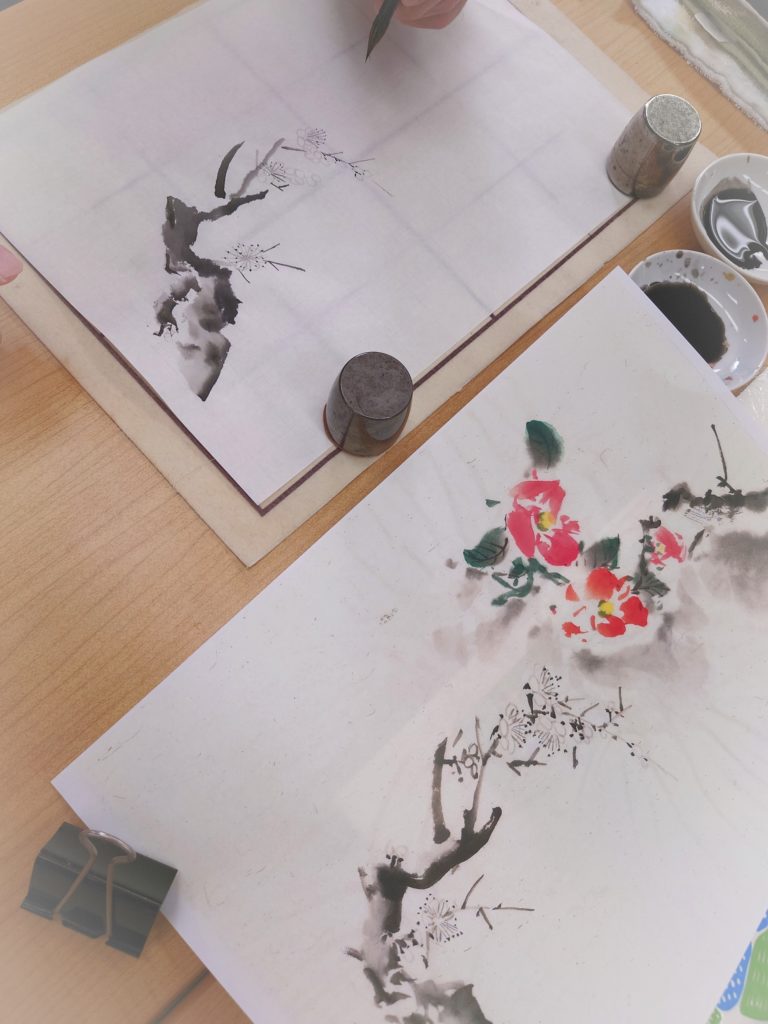 今日のテーマは、樹木と椿です。枝の先の花を描いているところです。とても細かい作業です。