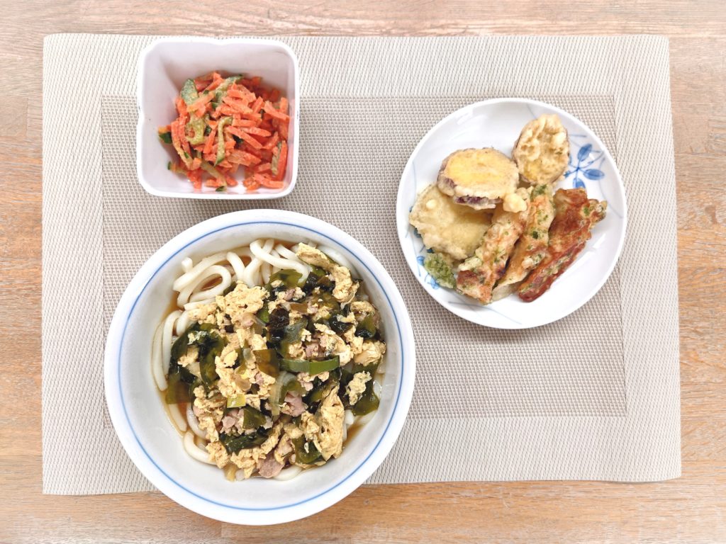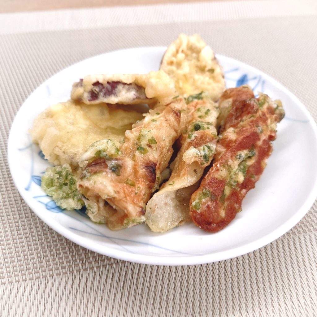 今日の揚げ物は、サツマイモとちくわ。青のりの香りがするちくわの揚げ物は、磯部揚げ風味でうどんにピッタリでした。