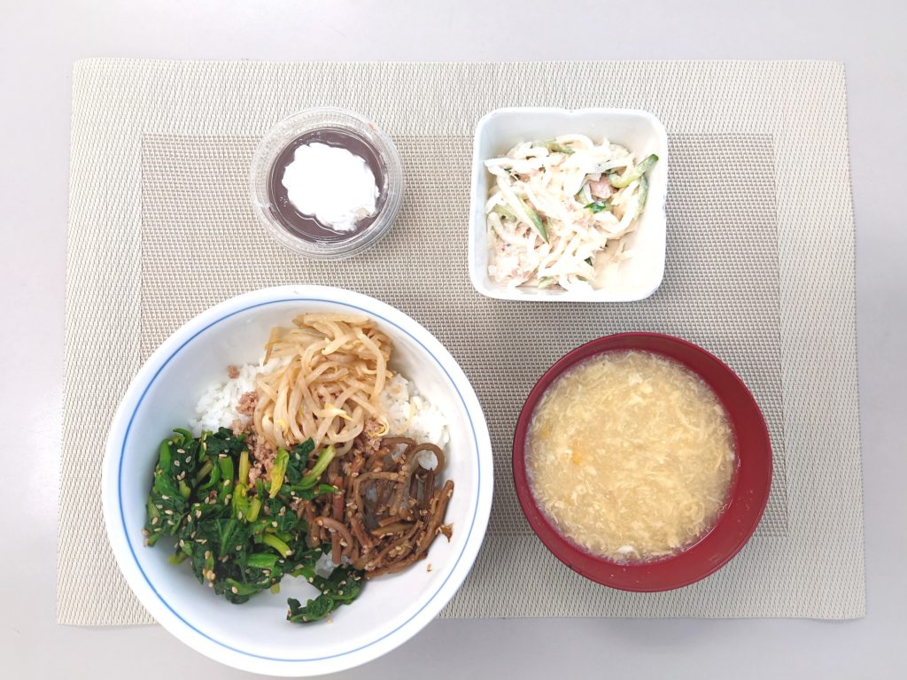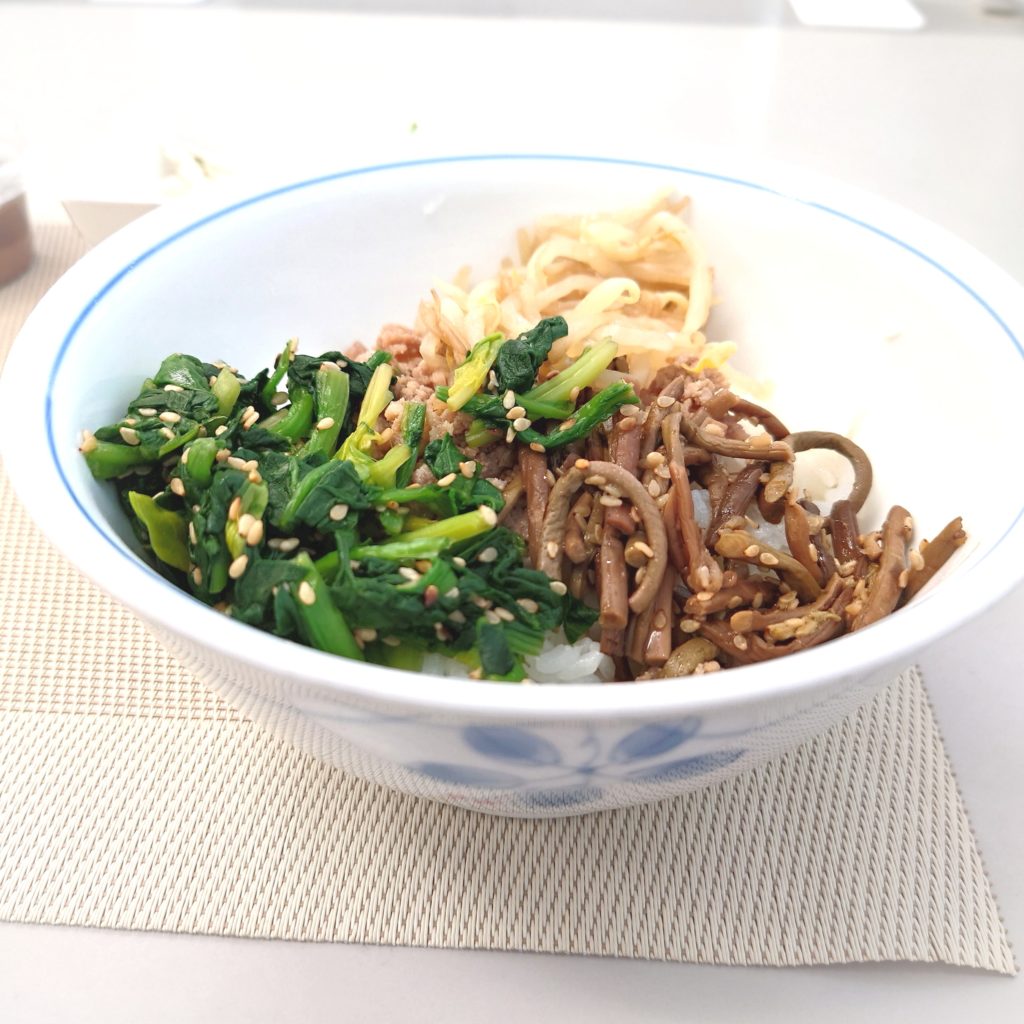 ぜんまいともやしとほうれん草で野菜たっぷりのビビンバ丼でした。