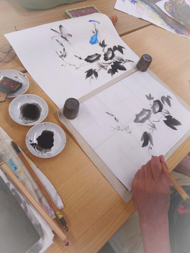 水墨画で朝顔を描かれています。墨の濃さの使い方がお上手です。