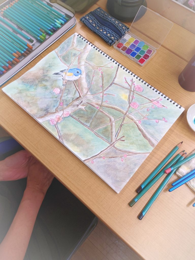 背景の色づかいの濃くなってきました。濃淡がはっきりとしてきて、小鳥が際立っています。