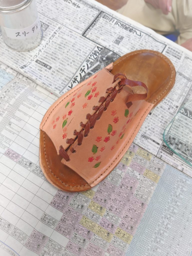 スリッパの裏面に皮を貼り付ける作業をされていました。完成まであともう少しです。