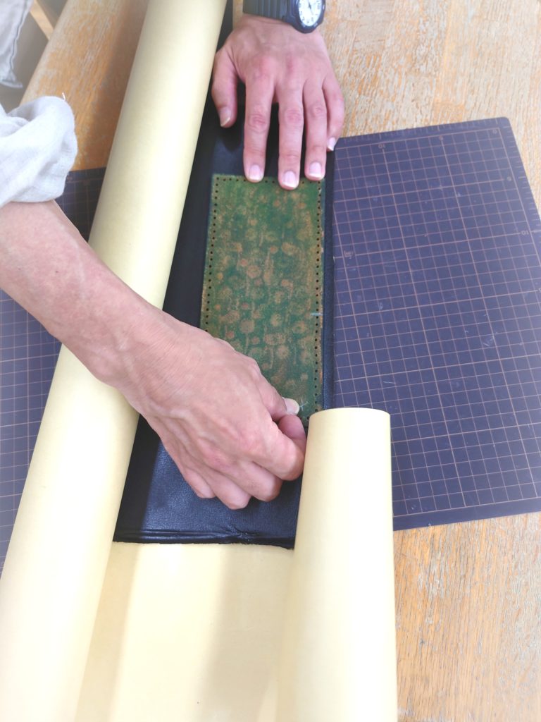 裏面の皮を貼りつけます。少し大きめに切って貼り付けてからぴったりのサイズにカットします。