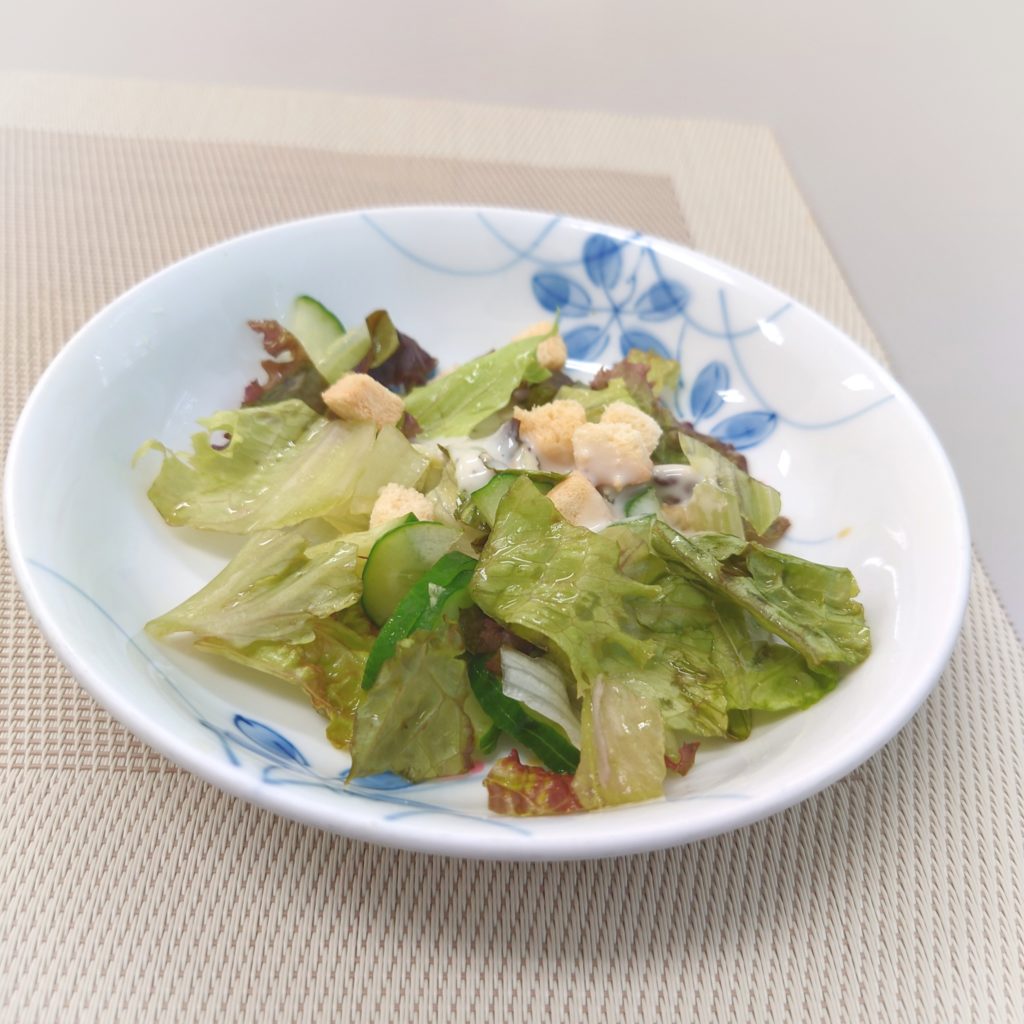 シャキシャキ野菜に濃厚なドレッシングが絡み、クルトンの香ばしさが絶妙なバランス。飽きのこない定番サラダです。