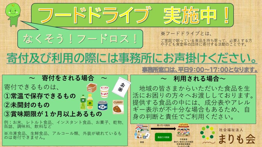 令和7年12月8日(月)より、まりも園とくるめ園と協働で「フードドライブ」を始めました。ご家庭で使いきれない未使用食品がありましたら、ぜひお持ち込みください。